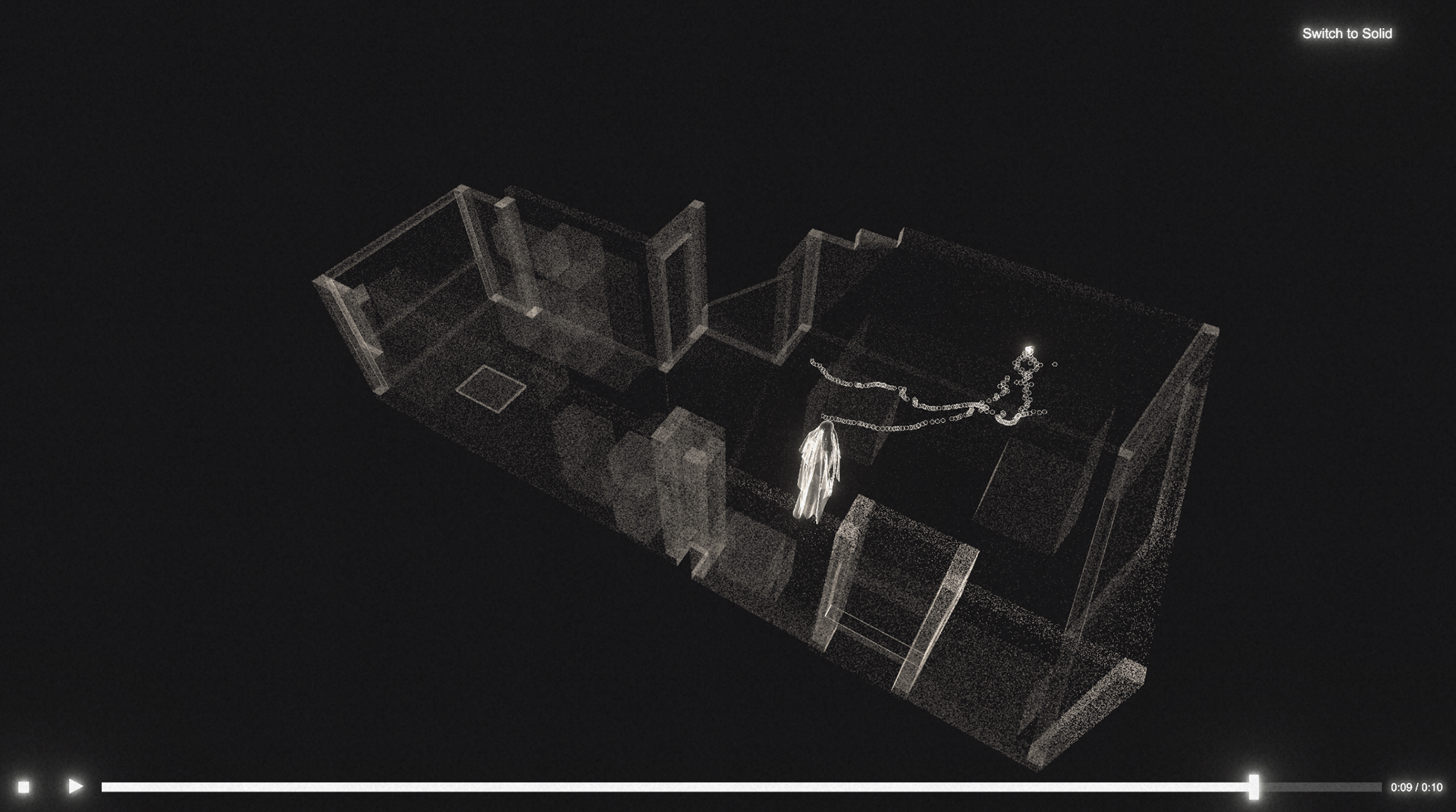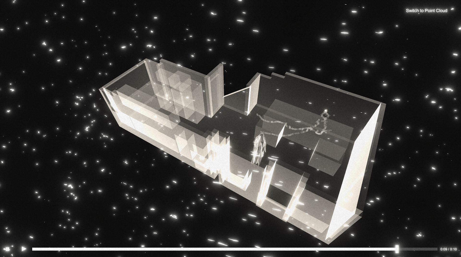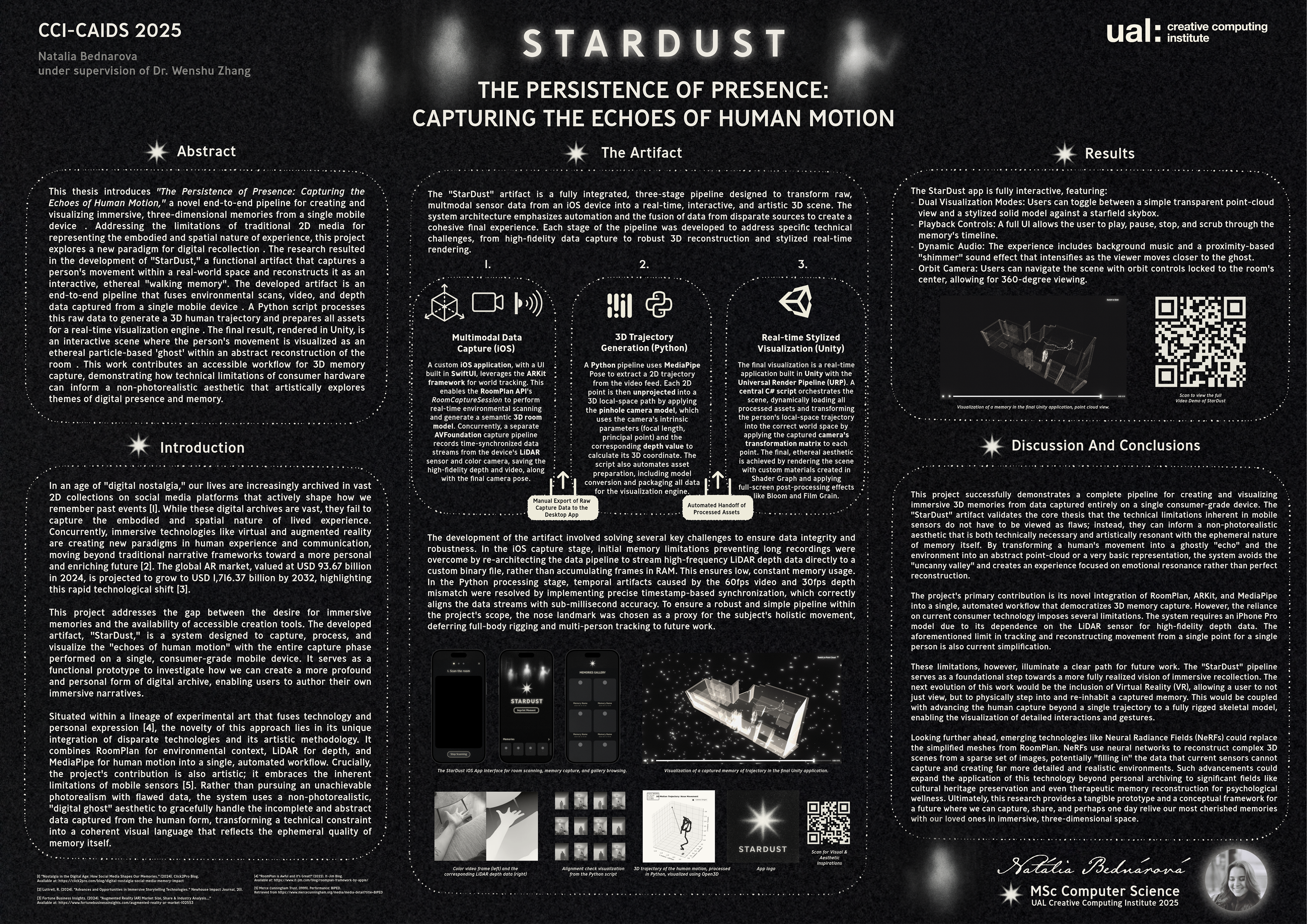 StarDust is an end-to-end pipeline for capturing and visualizing immersive, 3D "walking memories." The system transforms a recording of a person in a real-world space into an interactive, ethereal scene, allowing the user to re-experience a moment by viewing the subject's movement as a ghostly "echo" within a stylized reconstruction of the environment.