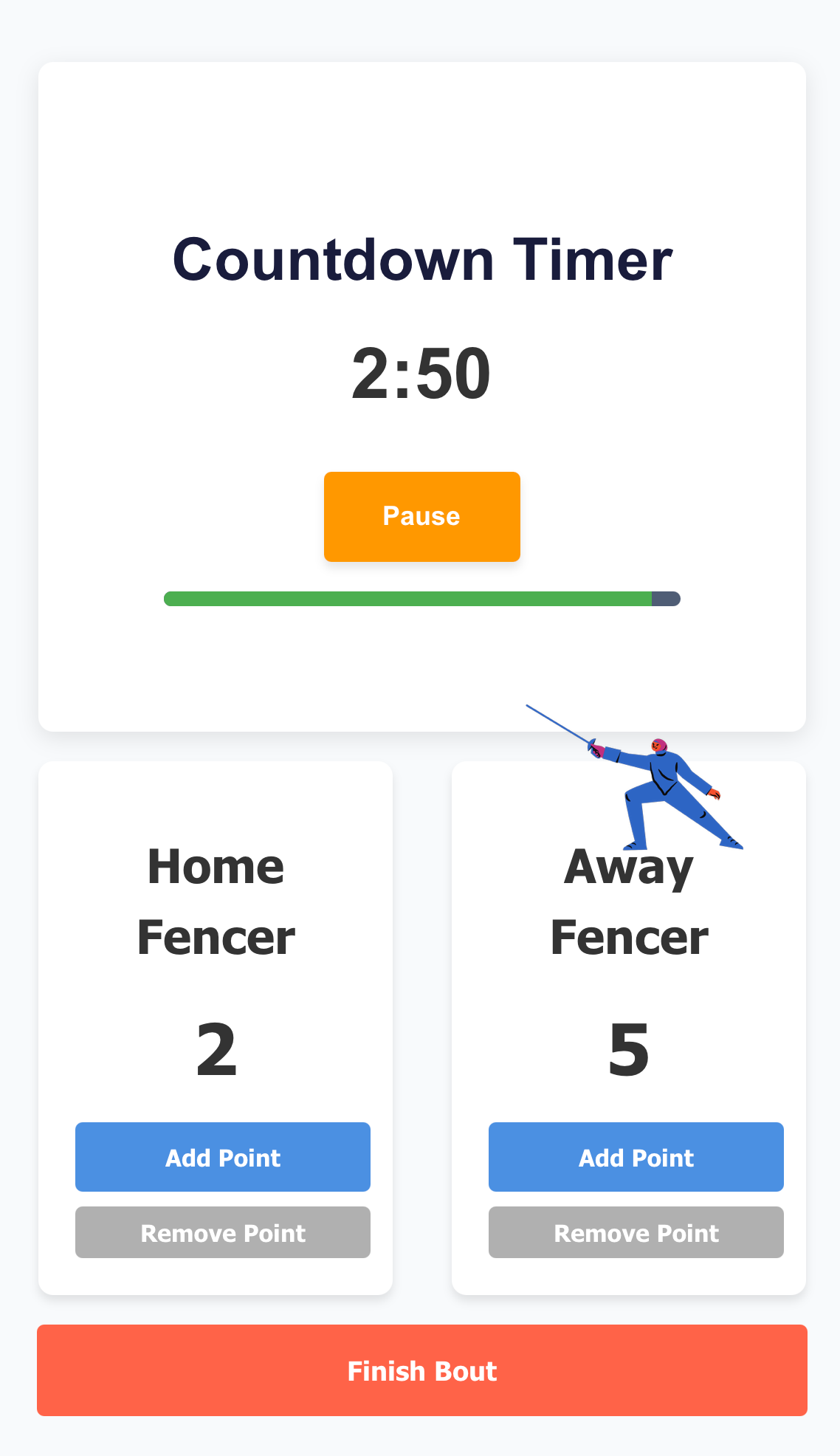 The timer component allows referees to set custom bout durations (defaulting to 3 minutes) with full pause/resume functionality. A dynamic progress bar provides visual feedback, changing from green to yellow to red as time runs out. The scoreboards feature animated fencer silhouettes that appear with a bounce effect whenever a point is scored, providing immediate visual feedback during fast-paced matches.